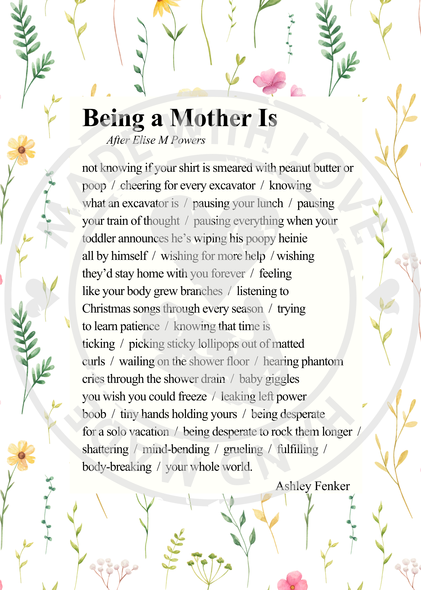 5x7 poetry print of “Being a Mother Is” by Ashley Fenker. This poem is inspired by Elise M Powers' poem with the same title, "Being a Mother Is," which is found in her new book, The Size of Your Joy. Visit elisepowers.com to purchase her new poetry collection.